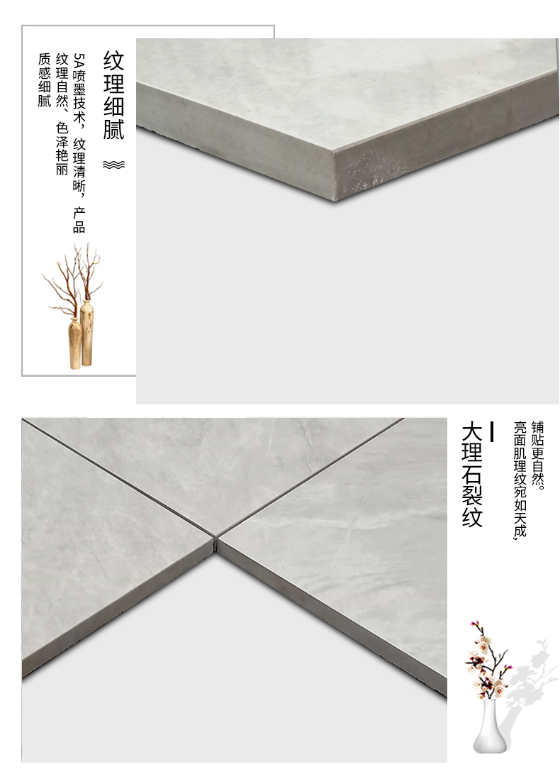 詳情:大理石瓷磚在瓷磚坯體上,顏色、肌理、功能無限地逼近天然石材巖層質(zhì)變效果,紋理質(zhì)感通透更強(qiáng), 優(yōu)點(diǎn):底坯與表面圖案逼近,表里如一;質(zhì)感更加真實(shí)厚重。通體大理石瓷磚產(chǎn)品經(jīng)過高噸位壓機(jī)壓制成型及高溫?zé)疲善反u坯色澤更加細(xì)膩,性能和品質(zhì)更高。